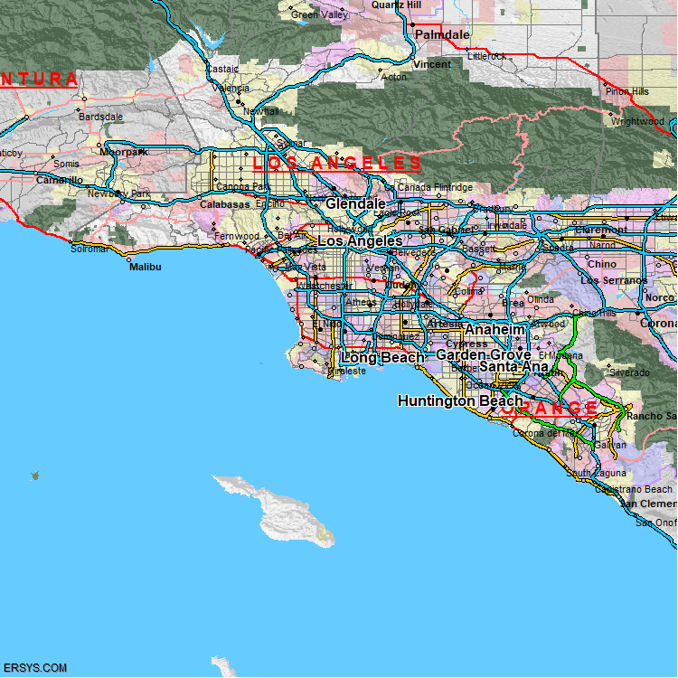 Los Angeles County, CA (shown in white) has 4,060.25 mi² of land area and 689.19 mi² of water resources. The county is bordered by: