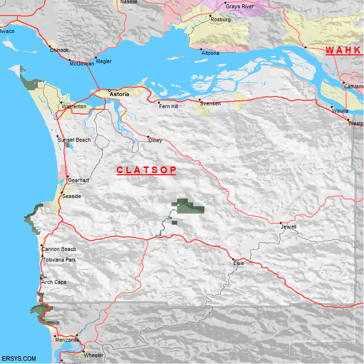 The estimated population of Clatsop County is 41,556 with 17,749 households. These households are spread across 10 unique municipalties (not all shown).