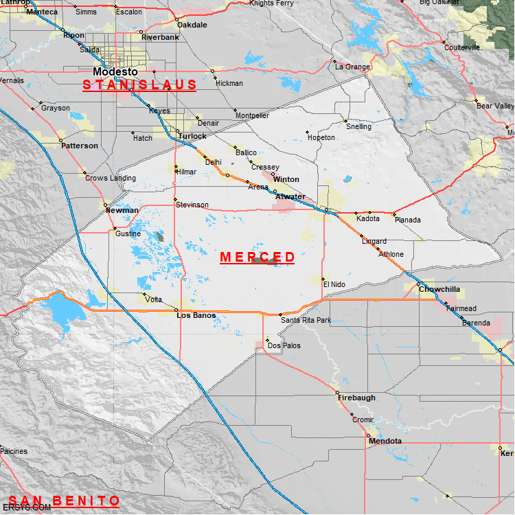 Merced County, CA (shown in white) has 1,938 mi² of land area and 40.65 mi² of water resources. The county is bordered by: