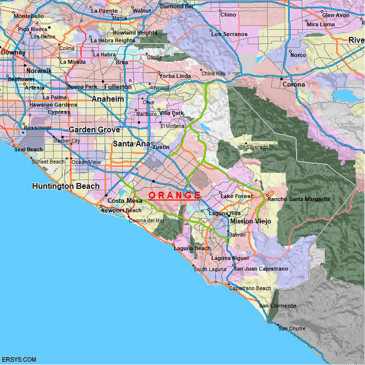 Orange County, CA (shown in white) has 792.86 mi² of land area and 156.86 mi² of water resources. The county is bordered by: