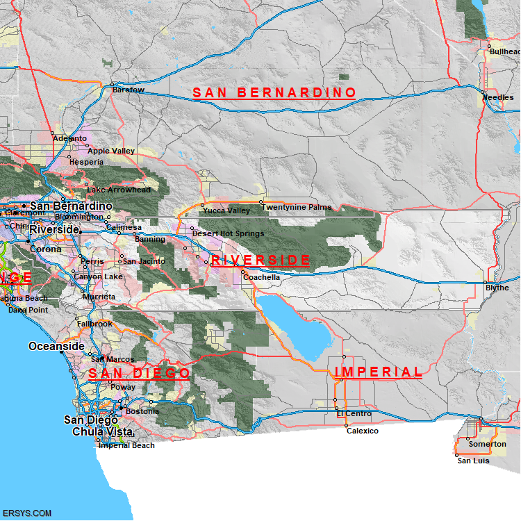 Riverside County, CA (shown in white) has 7,209.24 mi² of land area and 93.75 mi² of water resources. The county is bordered by: