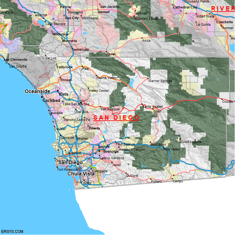 San Diego County, CA (shown in white) has 4,210.27 mi² of land area and 315.56 mi² of water resources. The county is bordered by: