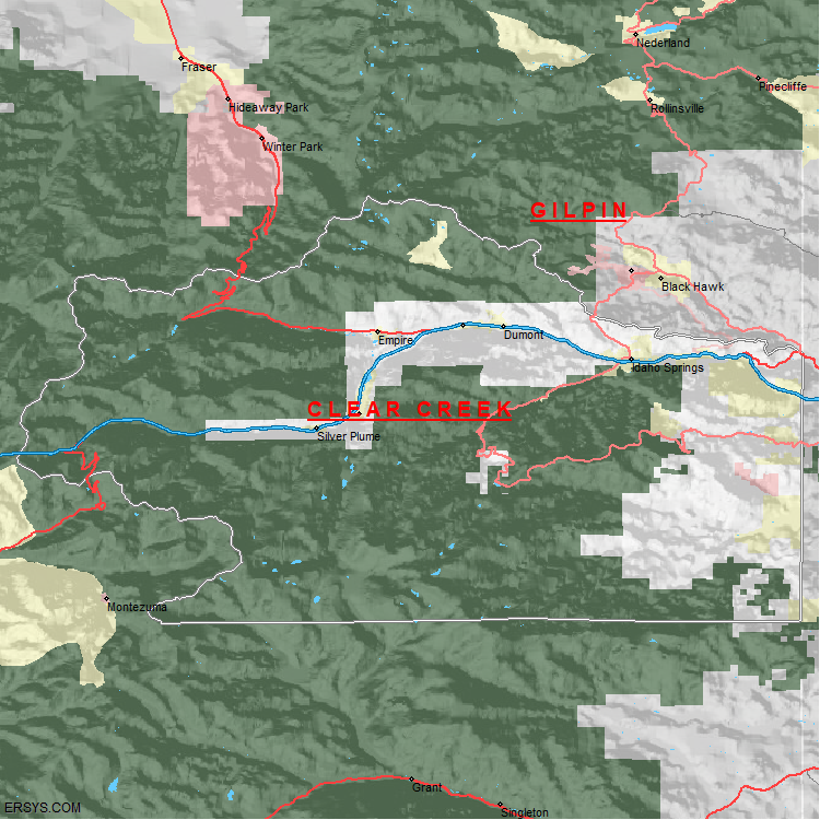 Clear Creek County, CO (shown in white) has 395.07 mi² of land area and 1.26 mi² of water resources. The county is bordered by: