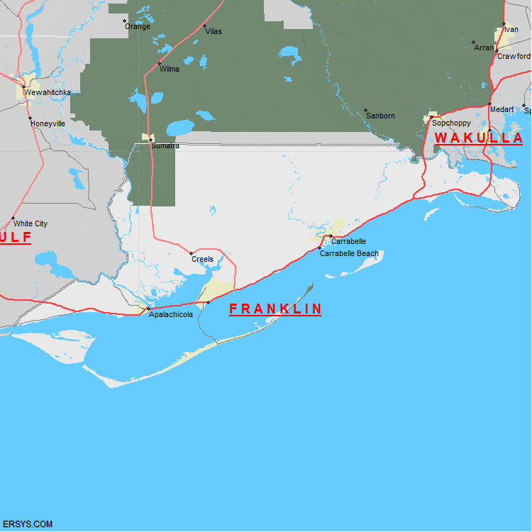 Franklin County, FL (shown in white) has 545 mi² of land area and 876.61 mi² of water resources. The county is bordered by: