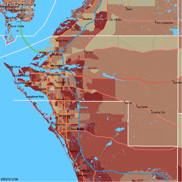 Median age is where half the people in an area are under that median age value and the other half are above that value. In the case of the map on the left, the darker areas show where the median age is the highest. An interesting use of median age is in comparing various areas. If one area shows a median age lower than another, you can say that area has a more youthful population without having to analyze the numbers beyond the median itself.