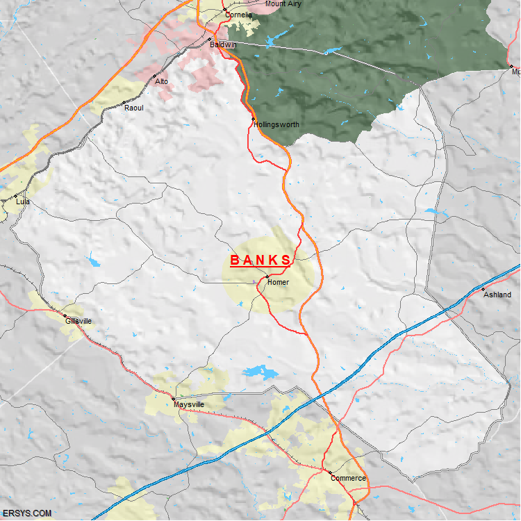 The estimated population of Banks County is 20,253 with 7,462 households. These households are spread across 3 unique municipalties (not all shown).