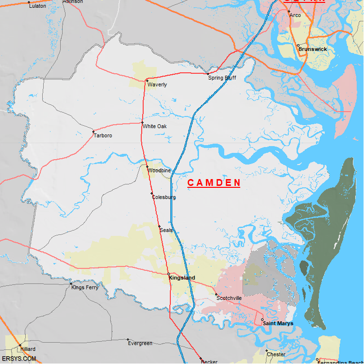 Camden County, GA (shown in white) has 630.27 mi² of land area and 151.64 mi² of water resources. The county is bordered by: