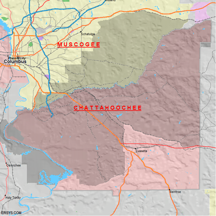 Chattahoochee County, GA (shown in white) has 248.74 mi² of land area and 2.42 mi² of water resources. The county is bordered by: