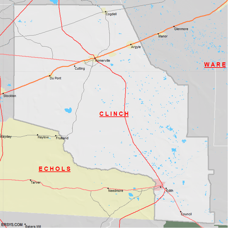 The estimated population of Clinch County is 6,762 with 2,591 households. These households are spread across 5 unique municipalties (not all shown).