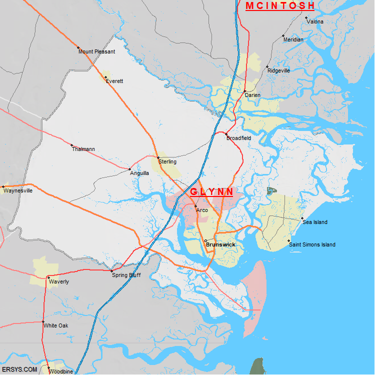 The estimated population of Glynn County is 87,841 with 35,661 households. These households are spread across 7 unique municipalties (not all shown).
