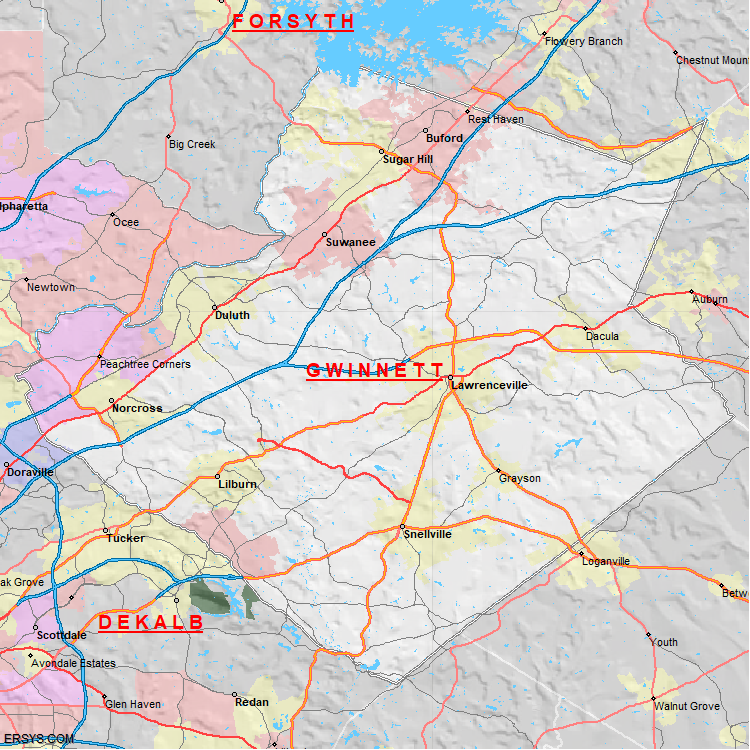 Gwinnett County, GA (shown in white) has 430.76 mi² of land area and 6.03 mi² of water resources. The county is bordered by: