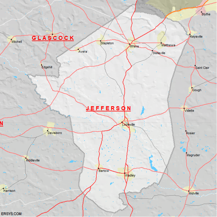 Jefferson County, GA (shown in white) has 526.56 mi² of land area and 3.11 mi² of water resources. The county is bordered by: