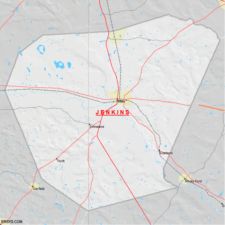 The estimated population of Jenkins County is 8,840 with 3,316 households. These households are spread across 2 unique municipalties (not all shown).