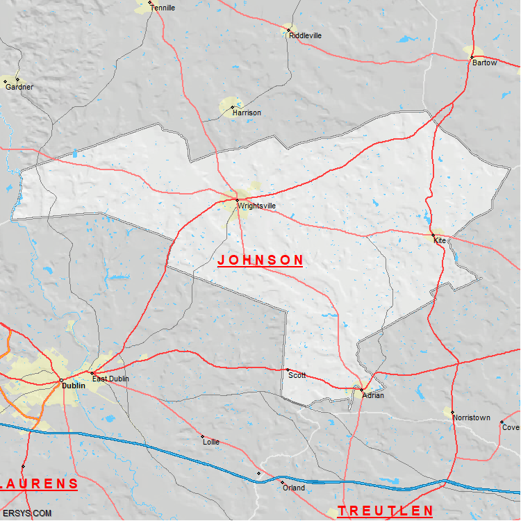 Johnson County, GA (shown in white) has 303.02 mi² of land area and 3.57 mi² of water resources. The county is bordered by: