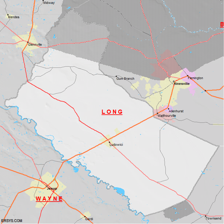 Long County, GA (shown in white) has 400.4 mi² of land area and 3.42 mi² of water resources. The county is bordered by: