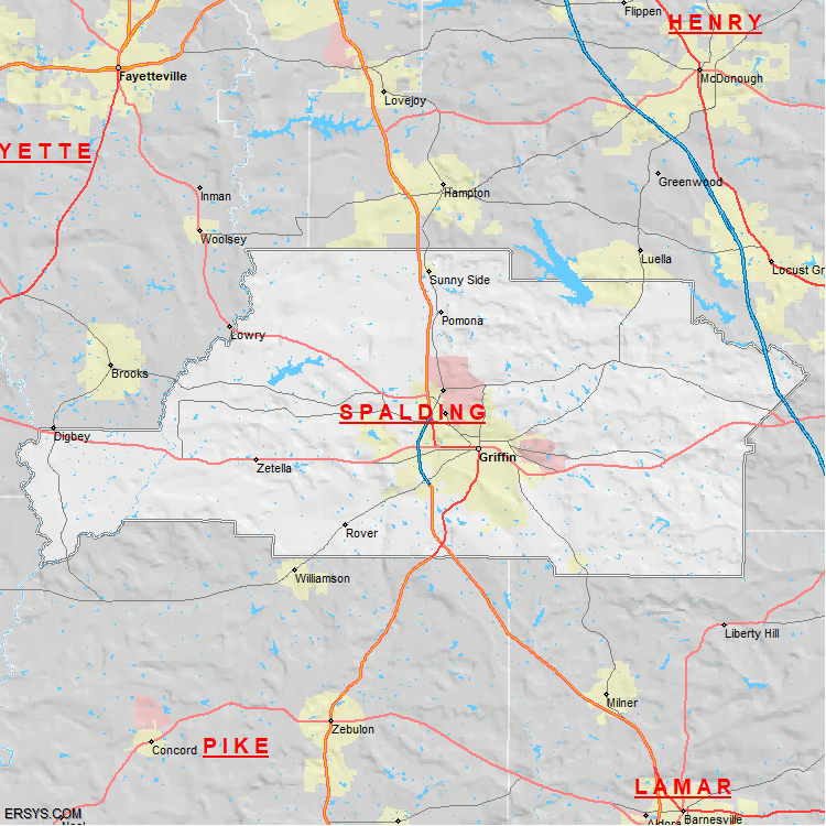 The estimated population of Spalding County is 71,408 with 27,323 households. These households are spread across 5 unique municipalties (not all shown).