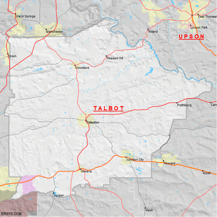 Talbot County, GA (shown in white) has 391.38 mi² of land area and 3.38 mi² of water resources. The county is bordered by: