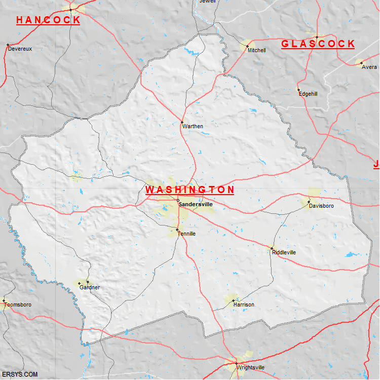 Washington County, GA (shown in white) has 678.53 mi² of land area and 5.83 mi² of water resources. The county is bordered by: