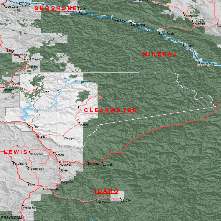 Clearwater County, ID (shown in white) has 2,457.31 mi² of land area and 30.73 mi² of water resources. The county is bordered by: