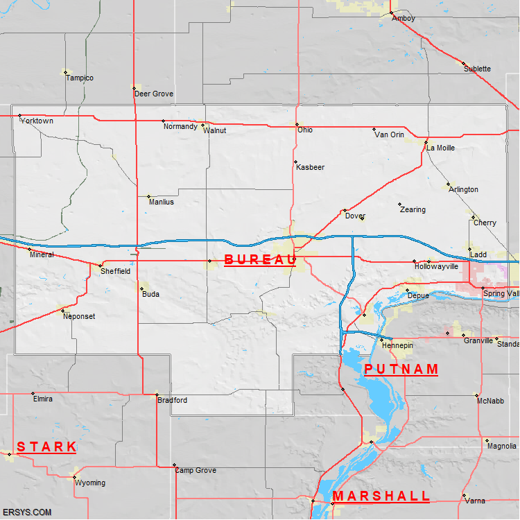 Bureau County, IL (shown in white) has 869.07 mi² of land area and 4.45 mi² of water resources. The county is bordered by: