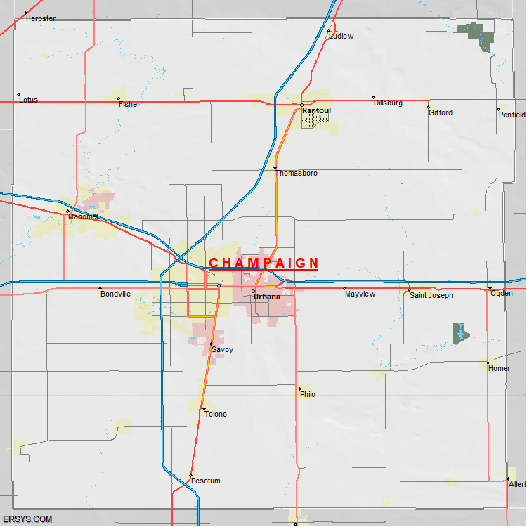 Champaign County, IL (shown in white) has 996.1 mi² of land area and 2.36 mi² of water resources. The county is bordered by: