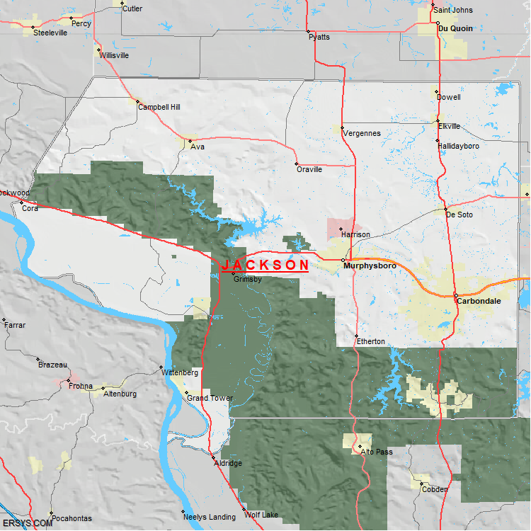 Jackson County, IL (shown in white) has 583.57 mi² of land area and 18.65 mi² of water resources. The county is bordered by: