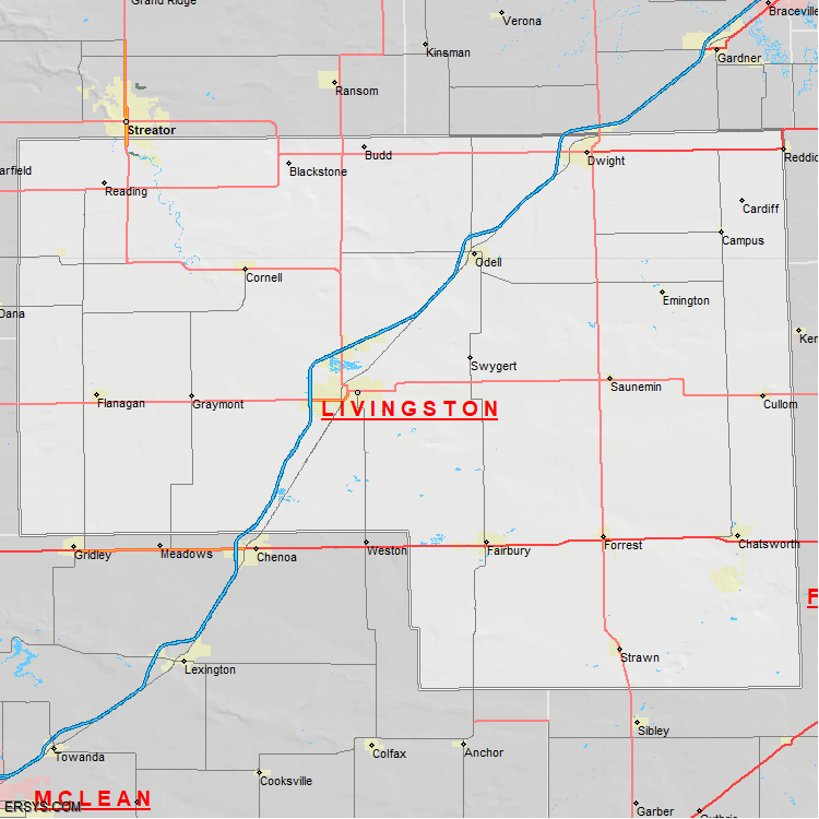 Livingston County, IL (shown in white) has 1,043.63 mi² of land area and 2.31 mi² of water resources. The county is bordered by: