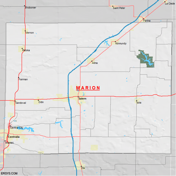 Marion County, IL (shown in white) has 572.54 mi² of land area and 3.57 mi² of water resources. The county is bordered by: