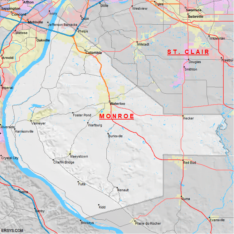 Monroe County, IL (shown in white) has 385.3 mi² of land area and 13.03 mi² of water resources. The county is bordered by: