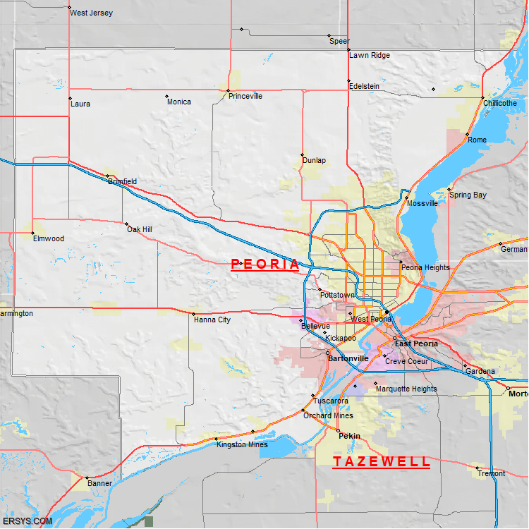 The estimated population of Peoria County is 178,499 with 74,396 households. These households are spread across 20 unique municipalties (not all shown).