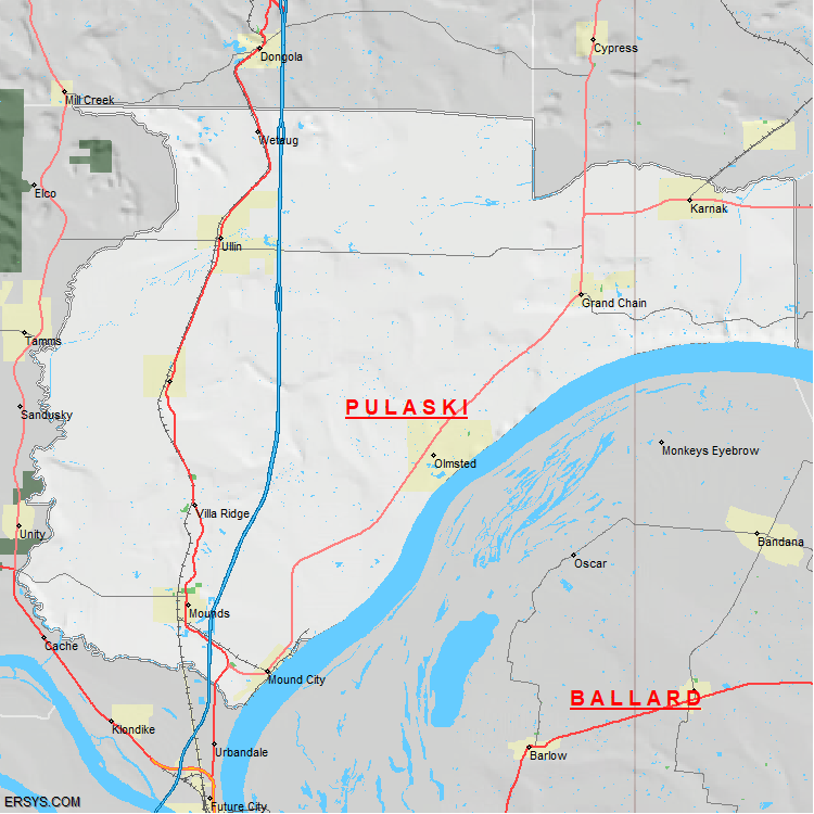 Pulaski County, IL (shown in white) has 199.27 mi² of land area and 3.77 mi² of water resources. The county is bordered by: