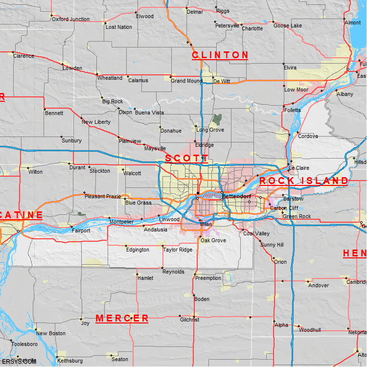 Rock Island County, IL (shown in white) has 427.5 mi² of land area and 23.8 mi² of water resources. The county is bordered by: