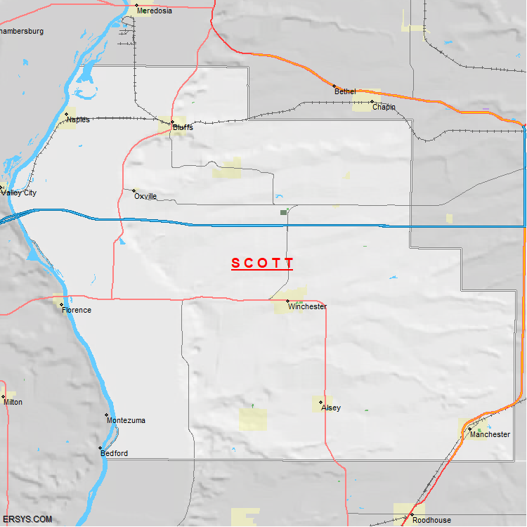 Scott County, IL (shown in white) has 250.79 mi² of land area and 1.86 mi² of water resources. The county is bordered by:
