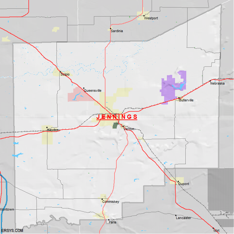 The estimated population of Jennings County is 27,953 with 10,721 households. These households are spread across 9 unique municipalties (not all shown).