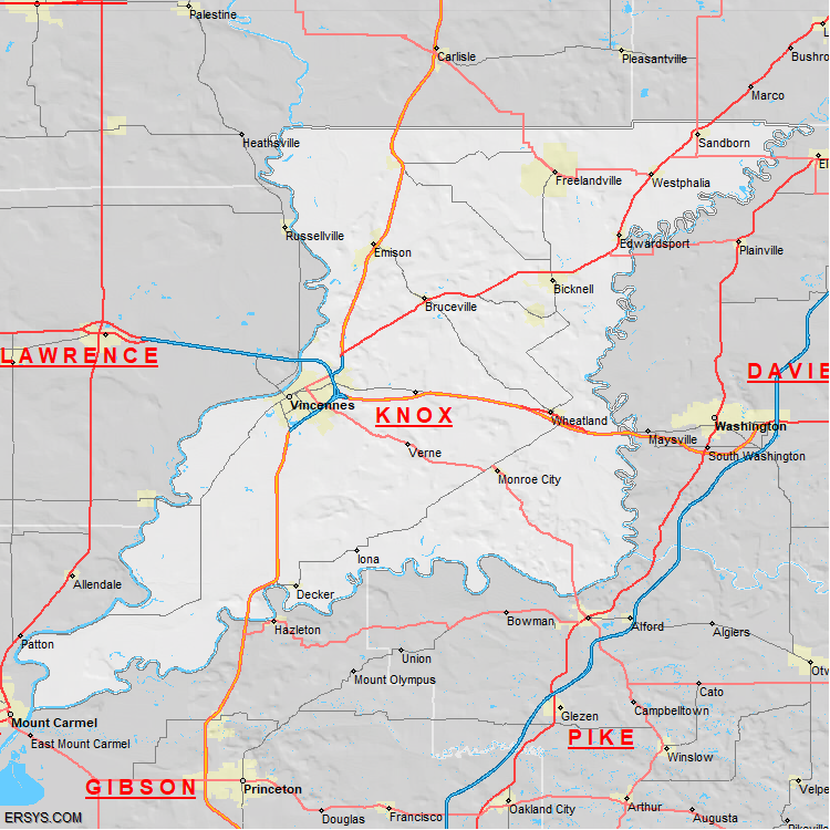 Knox County, IN (shown in white) has 515.83 mi² of land area and 8.07 mi² of water resources. The county is bordered by: