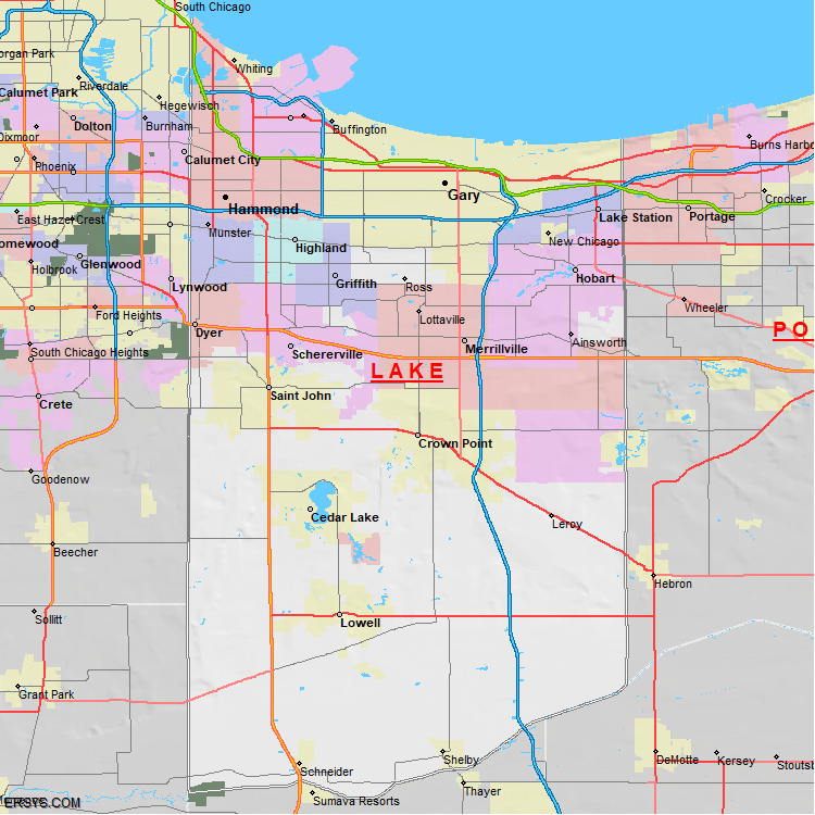 Lake County, IN (shown in white) has 498.88 mi² of land area and 127.75 mi² of water resources. The county is bordered by: