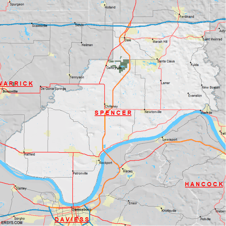 The estimated population of Spencer County is 20,099 with 7,997 households. These households are spread across 12 unique municipalties (not all shown).