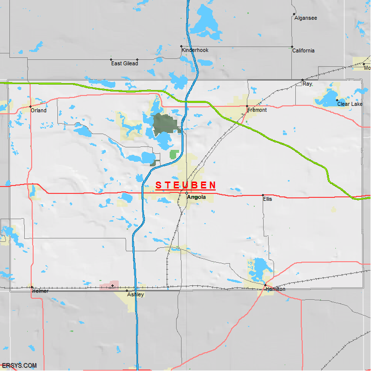 The estimated population of Steuben County is 34,735 with 13,888 households. These households are spread across 14 unique municipalties (not all shown).