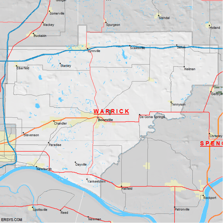 Warrick County, IN (shown in white) has 384.84 mi² of land area and 6.21 mi² of water resources. The county is bordered by: