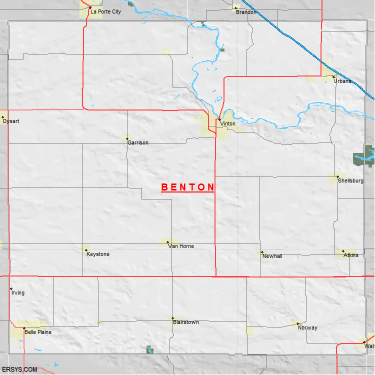 Benton County, IA (shown in white) has 716.1 mi² of land area and 2.26 mi² of water resources. The county is bordered by: