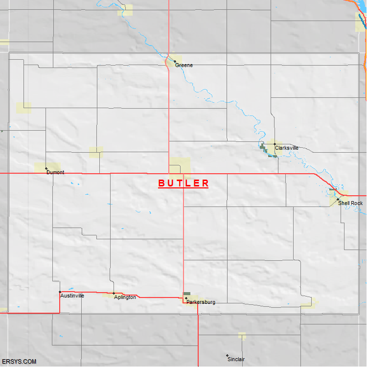 The estimated population of Butler County is 14,278 with 5,971 households. These households are spread across 10 unique municipalties (not all shown).