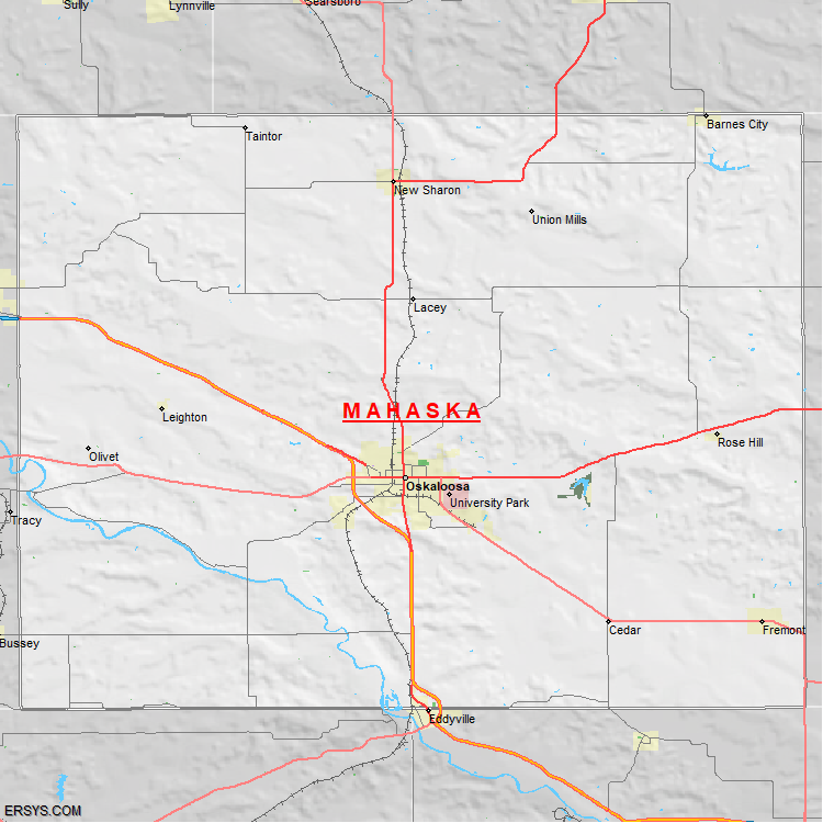 The estimated population of Mahaska County is 22,028 with 8,738 households. These households are spread across 9 unique municipalties (not all shown).