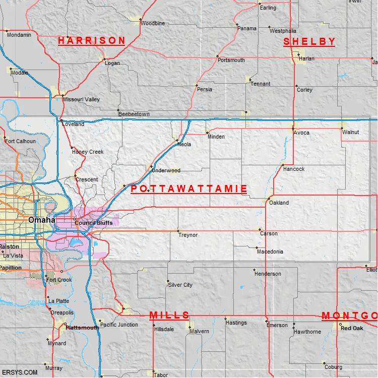 The estimated population of Pottawattamie County is 94,088 with 37,494 households. These households are spread across 18 unique municipalties (not all shown).