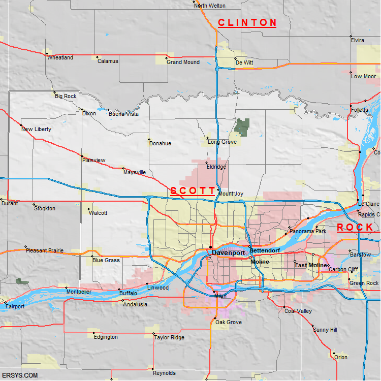 Scott County, IA (shown in white) has 458.1 mi² of land area and 10.11 mi² of water resources. The county is bordered by: