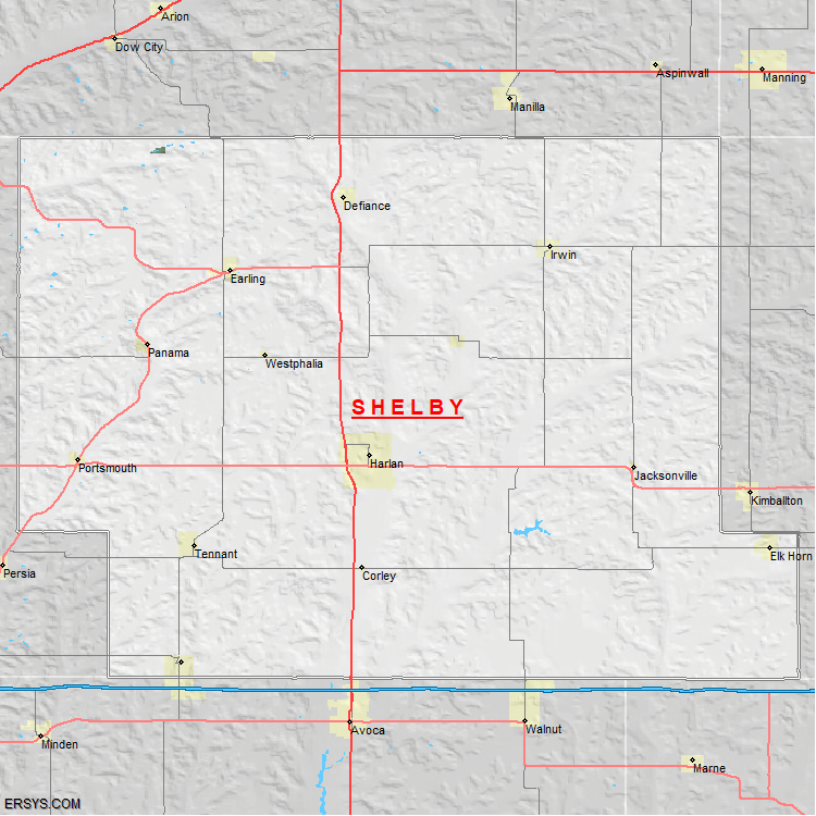 The estimated population of Shelby County is 11,900 with 5,053 households. These households are spread across 12 unique municipalties (not all shown).