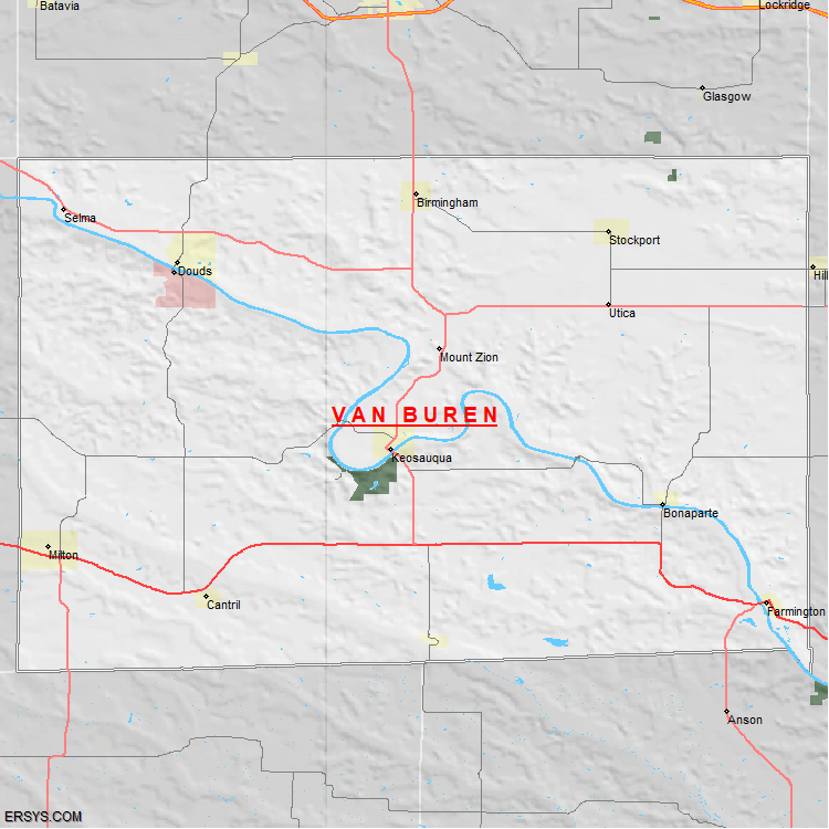 Van Buren County, IA (shown in white) has 484.79 mi² of land area and 5.75 mi² of water resources. The county is bordered by: