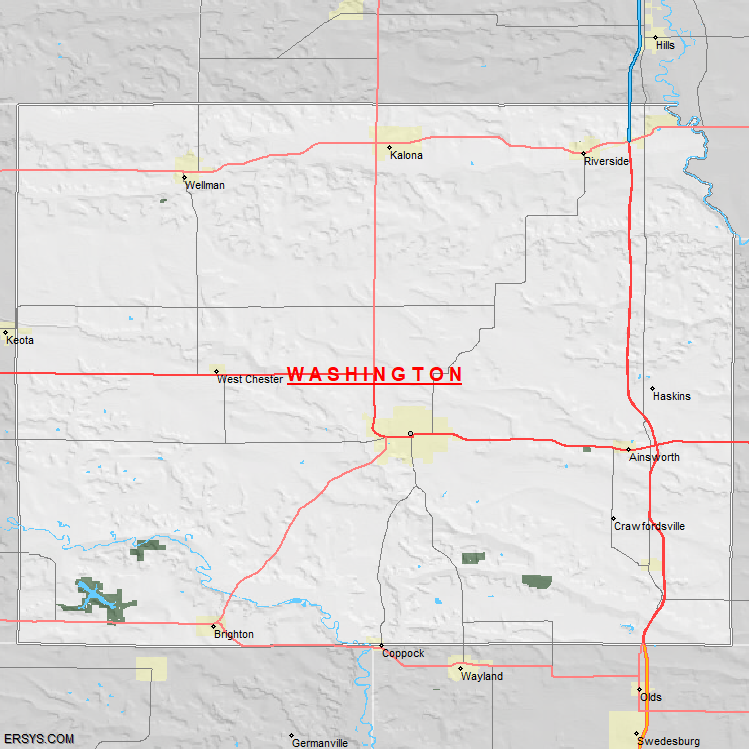 Washington County, IA (shown in white) has 568.83 mi² of land area and 2.06 mi² of water resources. The county is bordered by: