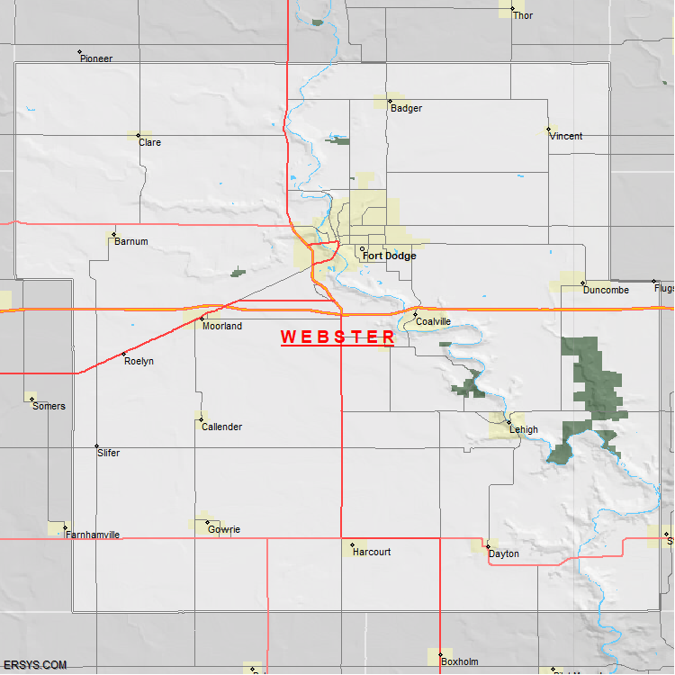 The estimated population of Webster County is 36,697 with 14,933 households. These households are spread across 14 unique municipalties (not all shown).