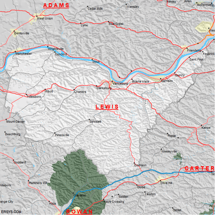 Lewis County, KY (shown in white) has 482.86 mi² of land area and 12.31 mi² of water resources. The county is bordered by: