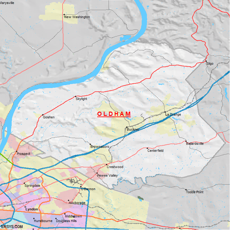 Oldham County, KY (shown in white) has 187.29 mi² of land area and 9.05 mi² of water resources. The county is bordered by: